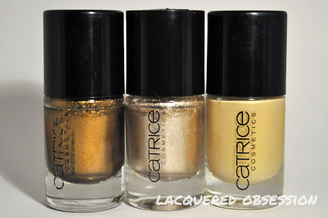Pri tejto trojici poviem len toľko... Nenosím zlatú. V mojej zbierke okrem týchto "do zlata ujdutých" lakov iné neuvidíte. 460 In The Bronx sa mi ale páči. Veľmi dobre vyzerá na nechtoch. Dobre sa lakuje. Vždy si pri ňom spomeniem na moju "brokátovú" manikúru, ktorú musím ešte zopakovať. Tento raz ale nie s praskavým lakom ale s maľovaným dekorom. 24 The GlamoureX Factor je fantastická mega nádherná farba. A to som práve povedala, že nemám rada zlatú. Je to veľmi studená zlatá, čo mi nesmierne vyhovuje. Na slnku sa krásne trbliece. Tento lak so mnou prežil Pohodu 2013 a za tri dni sa neolúpal, čo považujem za skvelý výkon. Posledný je 450 Sand Francisco. Tu na fotke vyzerá pačudesne. V skutočnosti je to taká piesková farba so zlatým simmerom. Kúpený tiež vo výpredaji, inak by som mu šancu asi nedala. Ja som ho na rukách ešte nemala...